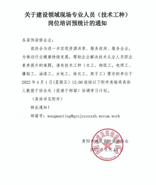 我协会为进一步实现资源共享、服务政府、服务企业,为推动行业健康持续发展,帮助企业解决技术从业人员职业素养提升的难题,请有技术工种(木工、砌筑工,电焊工、镶贴工、油漆工、水电工、抹灰工、架子工)需求的单位于2022年4月1日(星期五)12:00前按以下附件表格将具体人数报于协会处(投递于邮箱)协调学习计划。